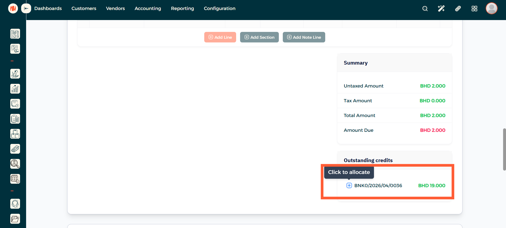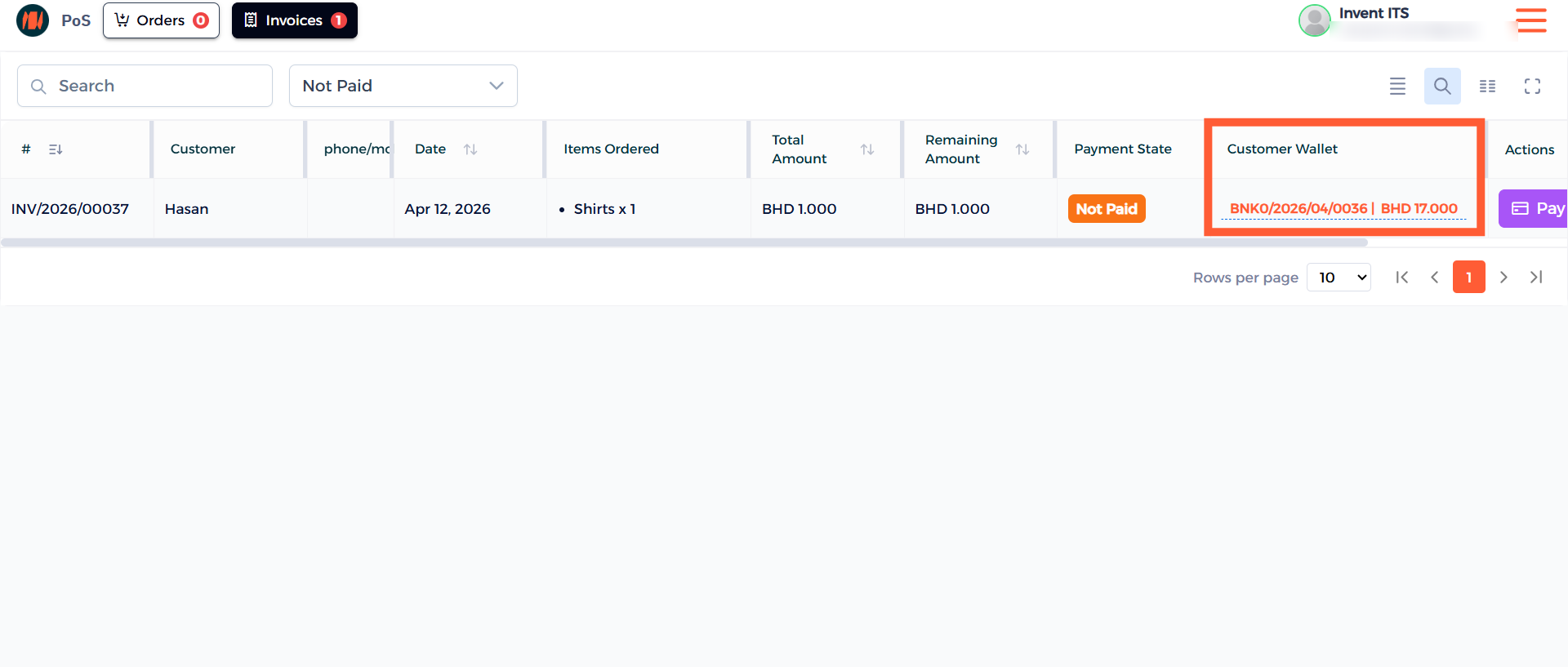 Here you can see the customer wallet section alongside the balance in your invoices page. Click on it to allocate the funds to complete the purchase.